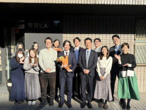税理士登録を祝し、花束と税理士名刺を贈呈。スタッフ一同で記念撮影(事務所前にて)